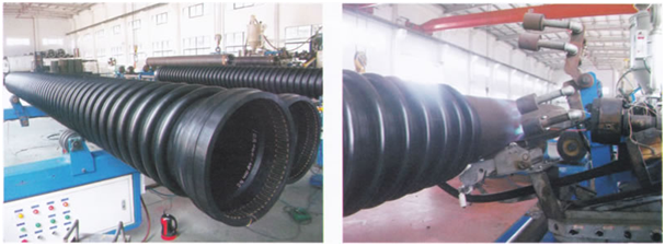 3、热态缠绕成型熔缝质量高:从挤塑机口模挤出的处于熔融状态的平料带和包覆料带,按预定的位置均匀的缠绕在加热的滚筒模具上,保证了结构壁管熔接缱质量.管材采用风冷却,材料冷却均匀。