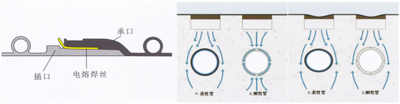 4、环柔性、韧性、绕性好柔性管在受压破坏前先变形一横向外扩,管材周围的回填土壤可以起到阻止柔性管变形和外扩的作用,外压负载就被传递和分摊到周围的回填土中去了。